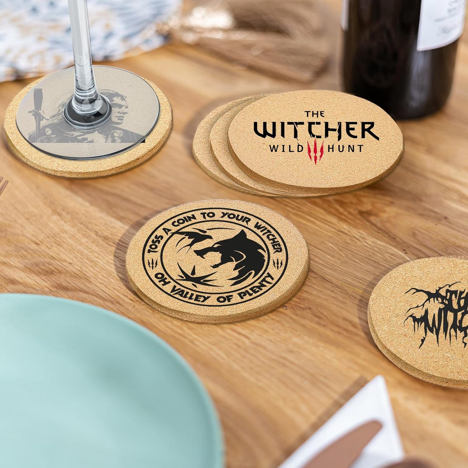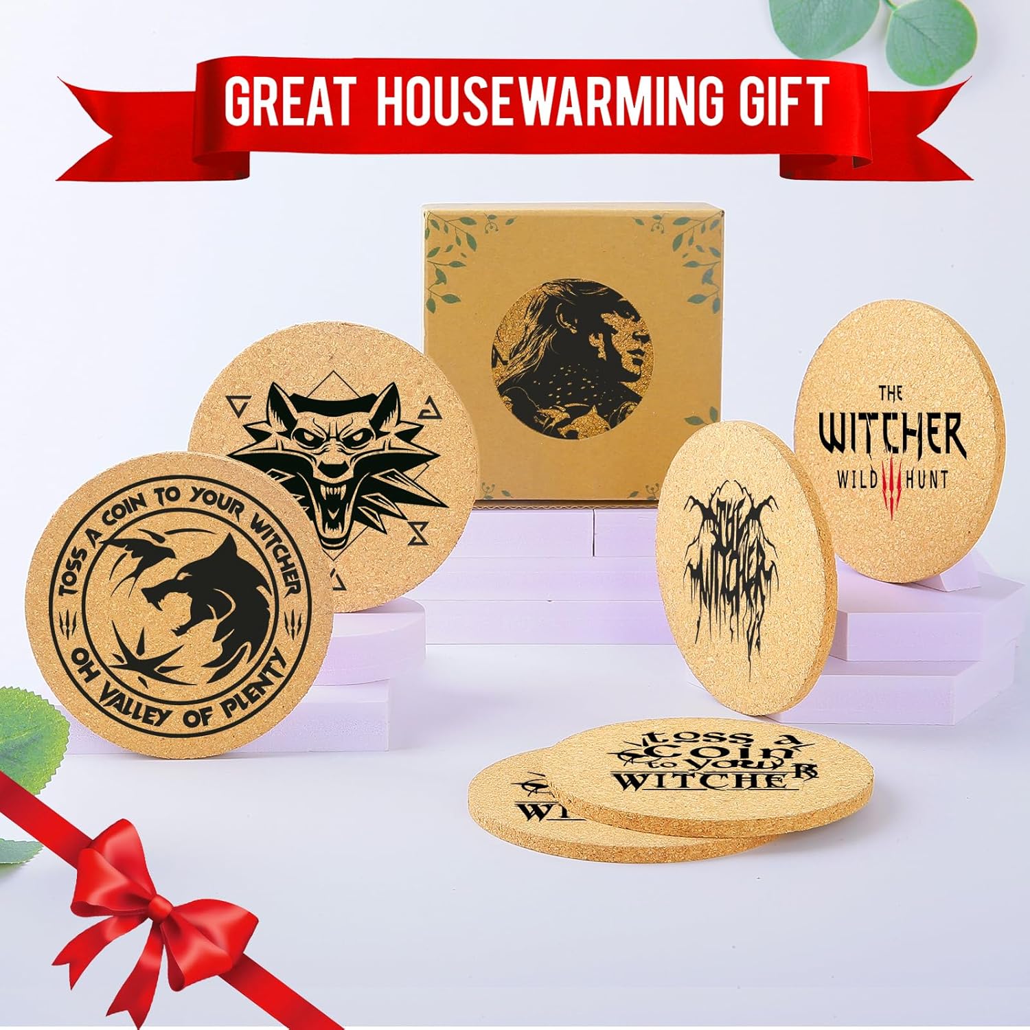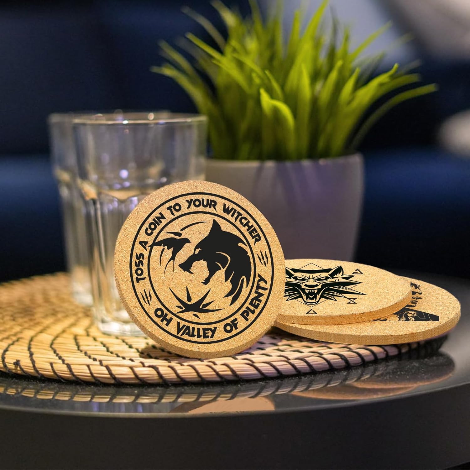 Coasters for Drinks with Holder Set of 6, Absorbent Cork Game of Rights Coaster for Cup Desk Office Table Kitchen Decor House Warming Gifts for New Home Couples, Round 4″