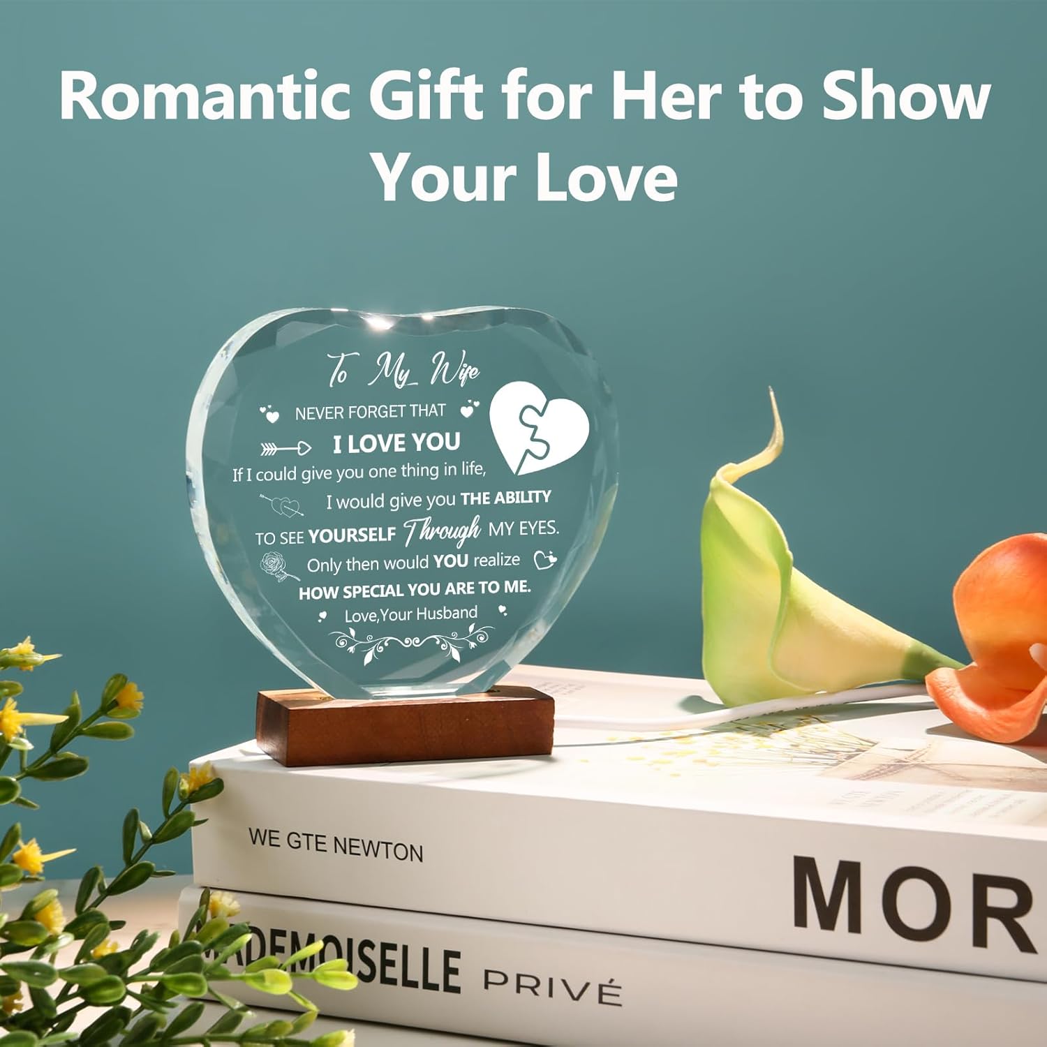 Romantic Gift: This Heart Crystal with LED Wood Base is Engraved the Love Quote “To My Wife, Never forget that I love you …” by Using Advanced Laser Technology, Making it a Romantic Gift to Express Your Love. And It will not Fade in a Lifetime, a Gift for a Lifetime, Your Love will Last a Lifetime Like this Eternal Crystal Gift.
