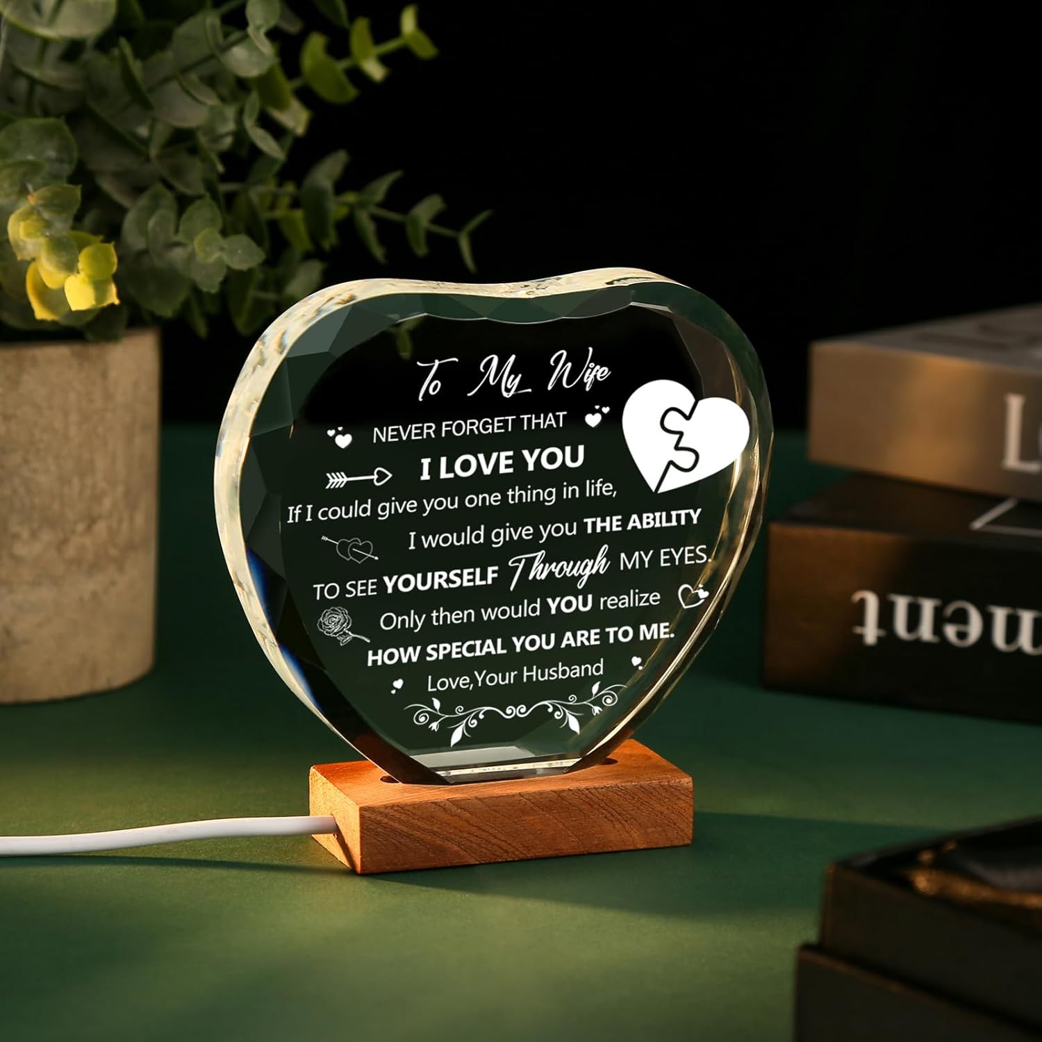 Romantic Gift: This Heart Crystal with LED Wood Base is Engraved the Love Quote “To My Wife, Never forget that I love you …” by Using Advanced Laser Technology, Making it a Romantic Gift to Express Your Love. And It will not Fade in a Lifetime, a Gift for a Lifetime, Your Love will Last a Lifetime Like this Eternal Crystal Gift.