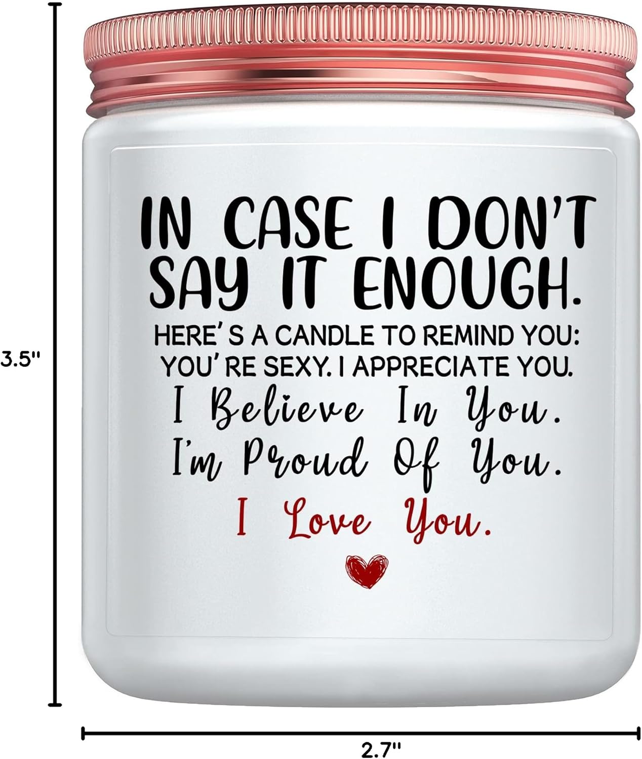 HIGH QUALITY CANDLE GIFT: Make a statement of love with this candle that burns for approximately 45 hours, is made of natural soy wax and measures approximately 2.7 by 3.4 inches, just enough to fit in a gift box. The candle burns without black smoke and is environmentally friendly using a glass jar that is best for home decor, for storage or as a vase.