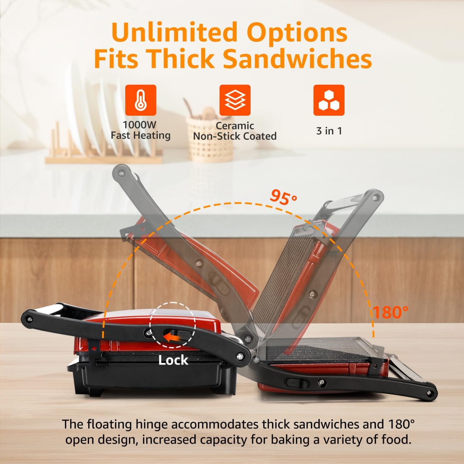 Panini Press Grill, Aigostar 1000W Sandwich Maker with Ceramic Non-stick Plates, Opens 180 Degrees for Any Size Food, 3-in-1 Sandwich Press Electric Grill, Drip Spout & Locking Lid, Red