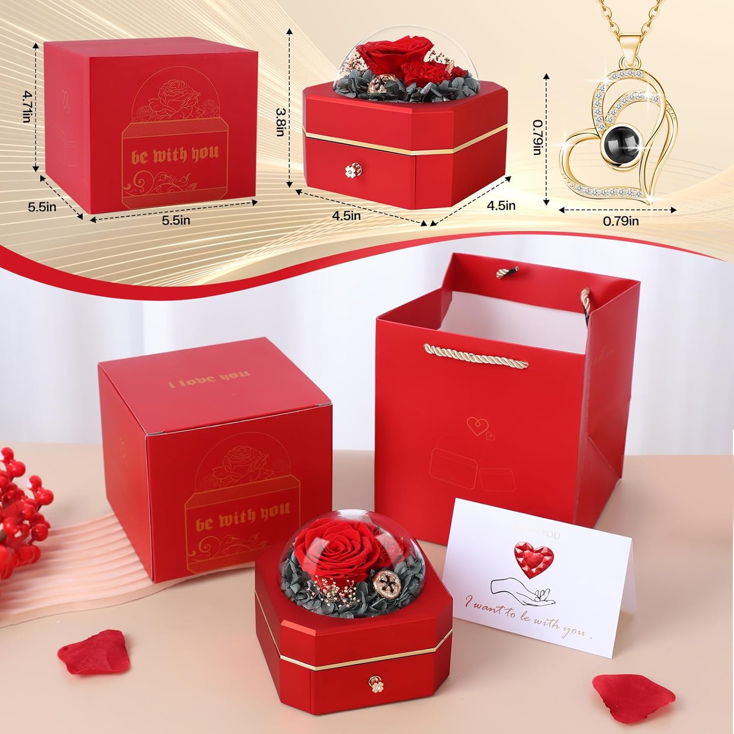 What You Get-The preserved rose necklace set includes a necklace with 100 languages I LOVE YOU,a gifts box of rose,and a greeting card